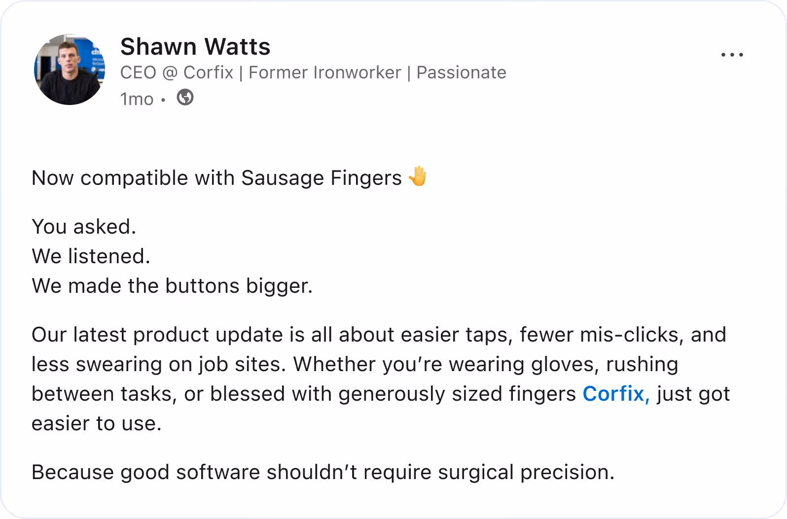 There's no new way of thinking to learn. If your crew can fill out a paper form, they can use Corfix. Customers like Dan L. cut their daily time cards from 30 minutes down to 1 minute. Your crew won't use it because you told them to. They'll use it because it's faster and easier than what they were doing before.