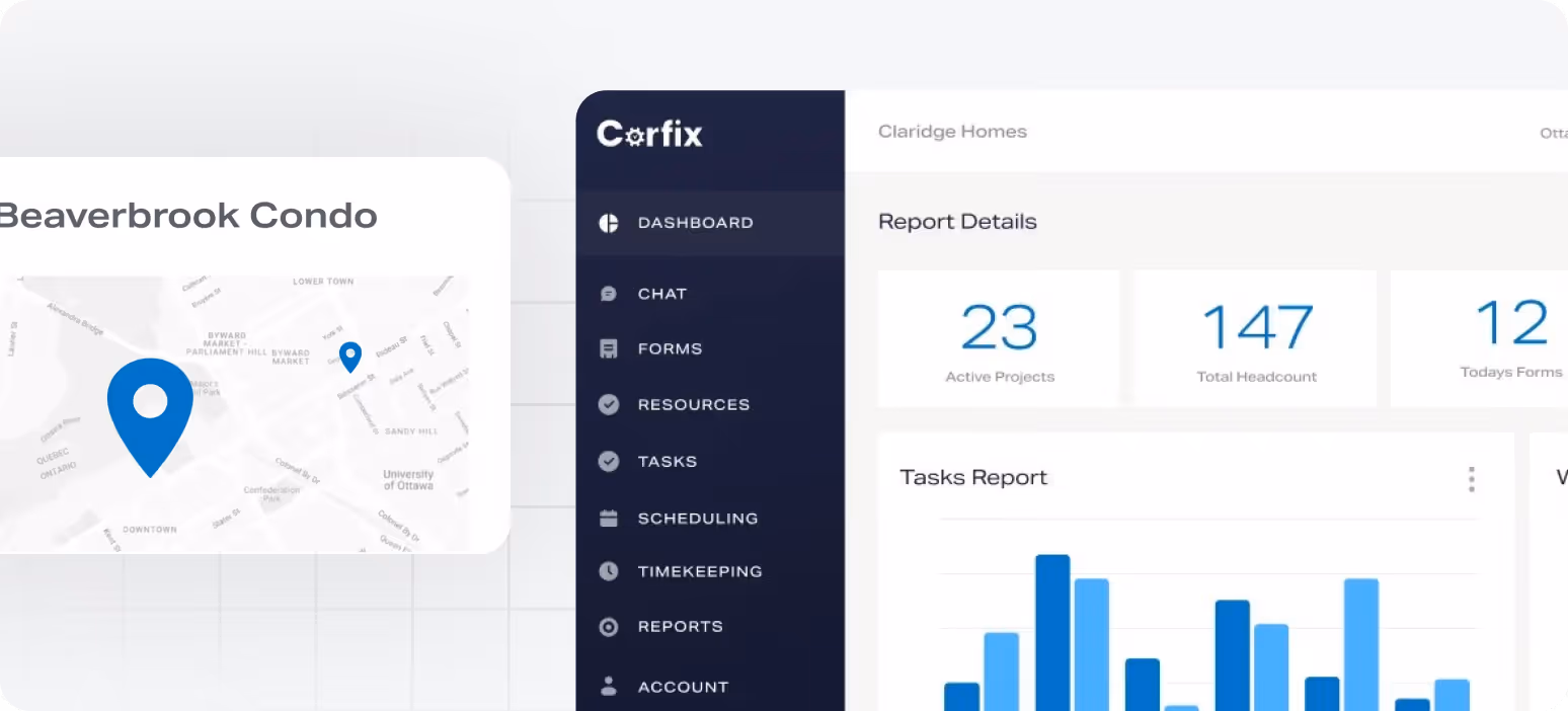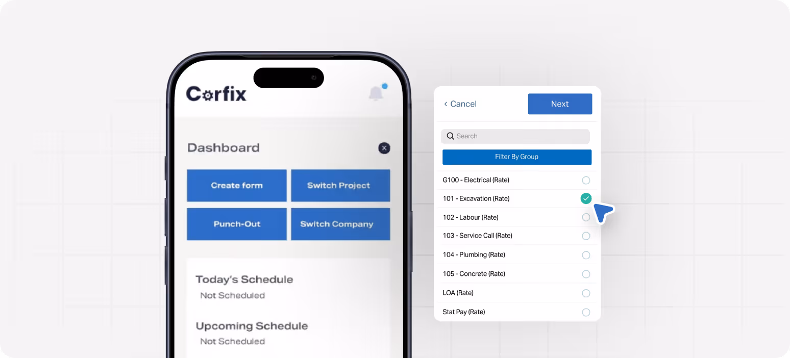Corfix handles safety, time tracking, scheduling, cert management, inductions, asset tracking and payroll, all in one place. Your crew clocks in and out from their phone, forms get filled out on site, and hours flow straight into Sage or QuickBooks with cost codes attached. One login for the crew, one dashboard for the office.